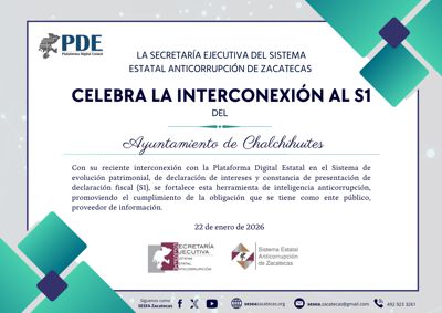 La SESEA celebra que los Ayuntamientos de Cañita de Felipe el Pescador y Chalchihuites, se incorporan desde este día información al S1 “Sistema de evolución patrimonial, de declaración de intereses y constancia de presentación de declaración fiscal” de la Plataforma Digital Estatal, aportando sus declaraciones en versión pública.